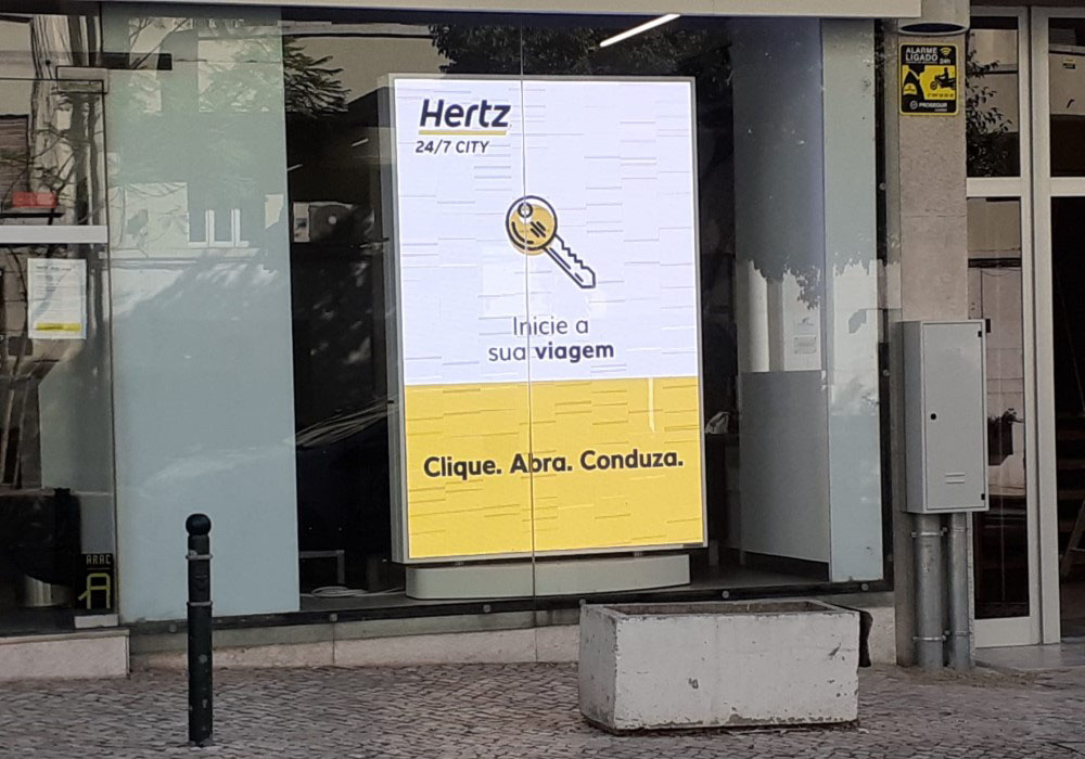 Projeto de instalação de LED Mupi na montra de uma loja Hertz em Lisboa, ajudando assim a uma maior projeção dos serviços e vantagens da marca.