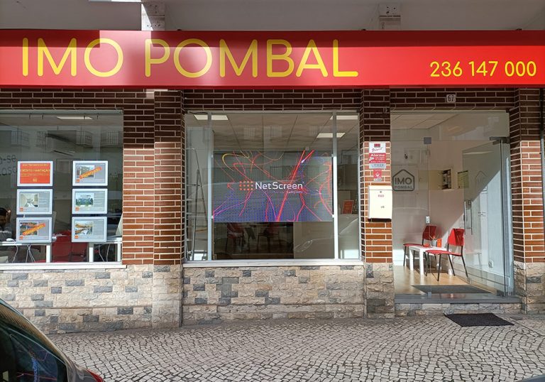 Instalação de LED Transparente na montra da imobiliária IMOPOMBAL, para comunicar melhor e destacar a oferta disponível.